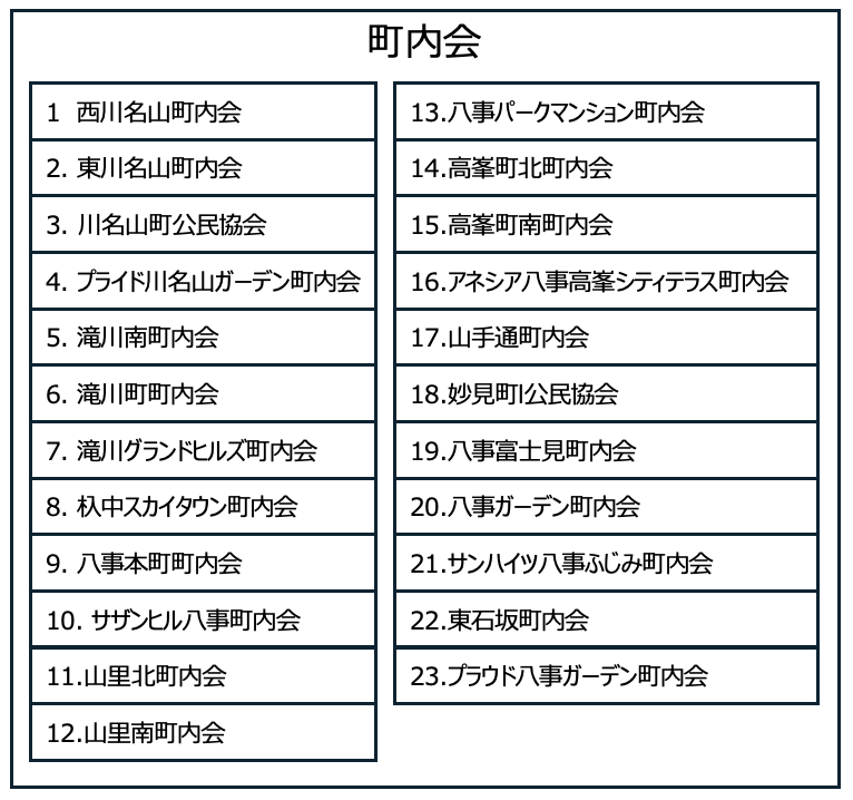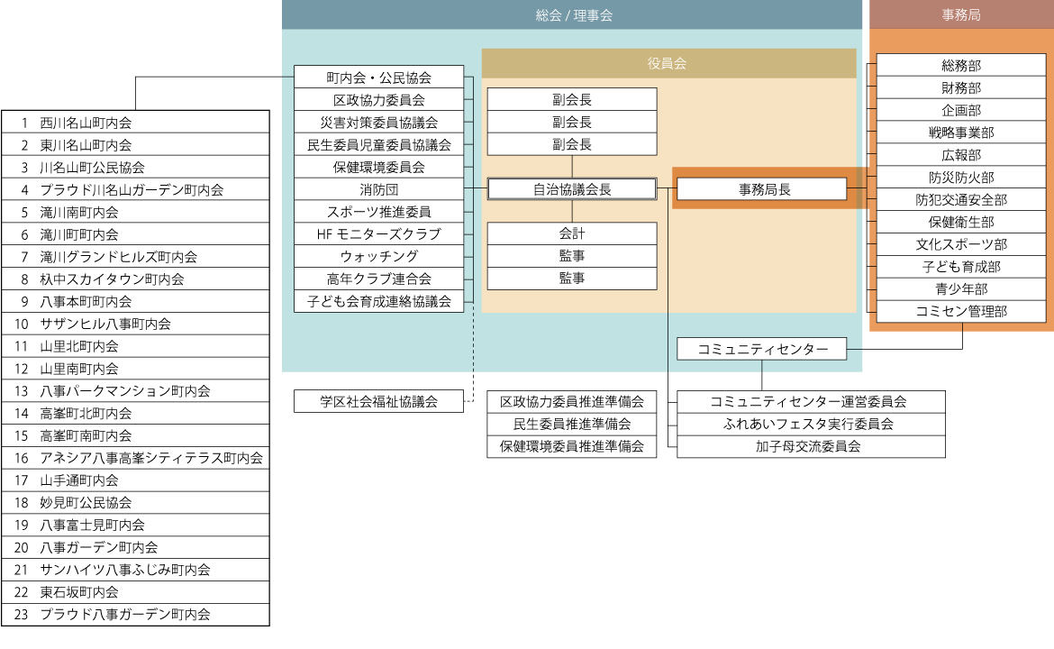 一般的には、学区連協は、区域内の町内会・自治会の他、 区政協力委員会や民生委員・児童委員協議会、 消防団、 子ども会などの団体で構成されていますが、あくまでも任意団体であるため、 構成団体は学区連協ごとに決めることができます。 滝川学区では加盟していない小学校PTAや学童保育所などが構成団体として入っている学区もあります。