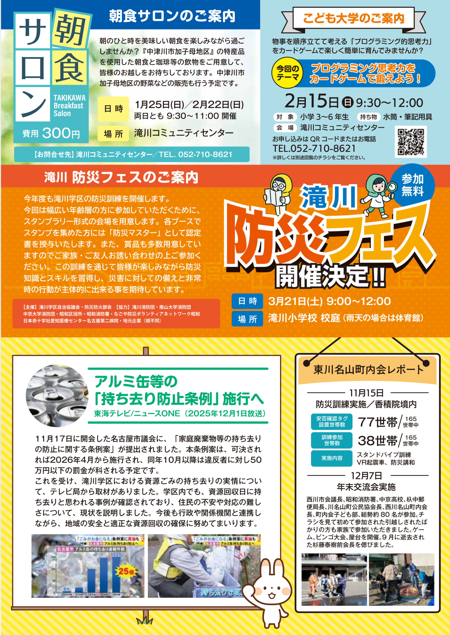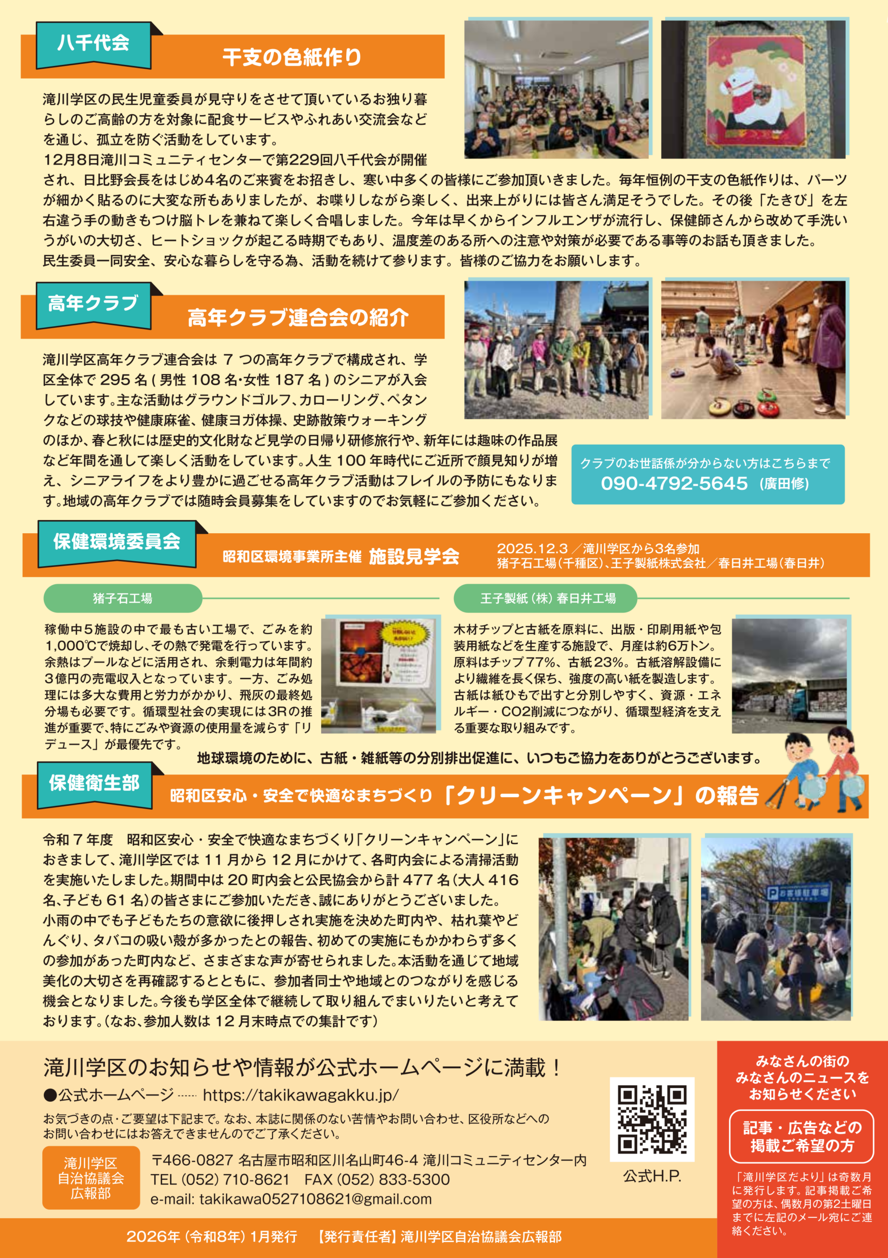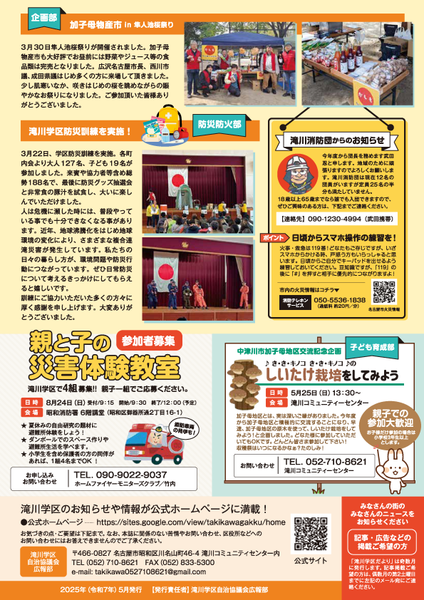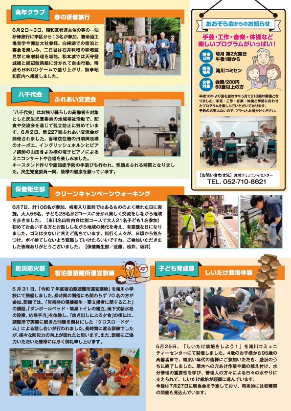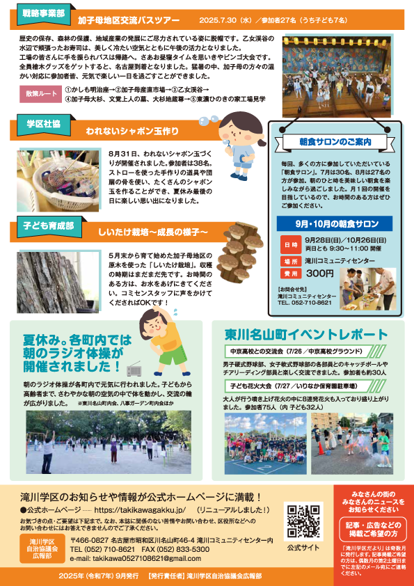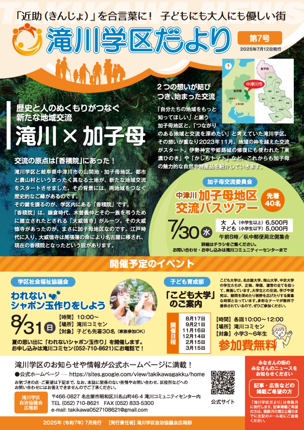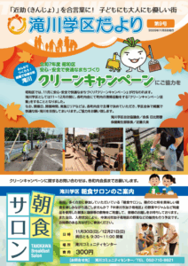 「滝川学区だより」は、滝川学区にお住まいの住民の方たちに、滝川学区での活動を定期的にお知らせするニュースレターです。各月で発行していく予定です。滝川コミュニティセンターで入手できるほか、町内会を通じて最新号をお届けしています。このページでは、最新号から過去のバックナンバーをご覧いただくことができます。