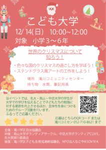 12月14日(日)10時から12時までの2時間、滝川コミュニティセンターで開催予定の滝川子ども大学は、「世界のクリスマスについて知ろう!」です。ぜひご参加ください。詳しくは下の画像を参照してください。