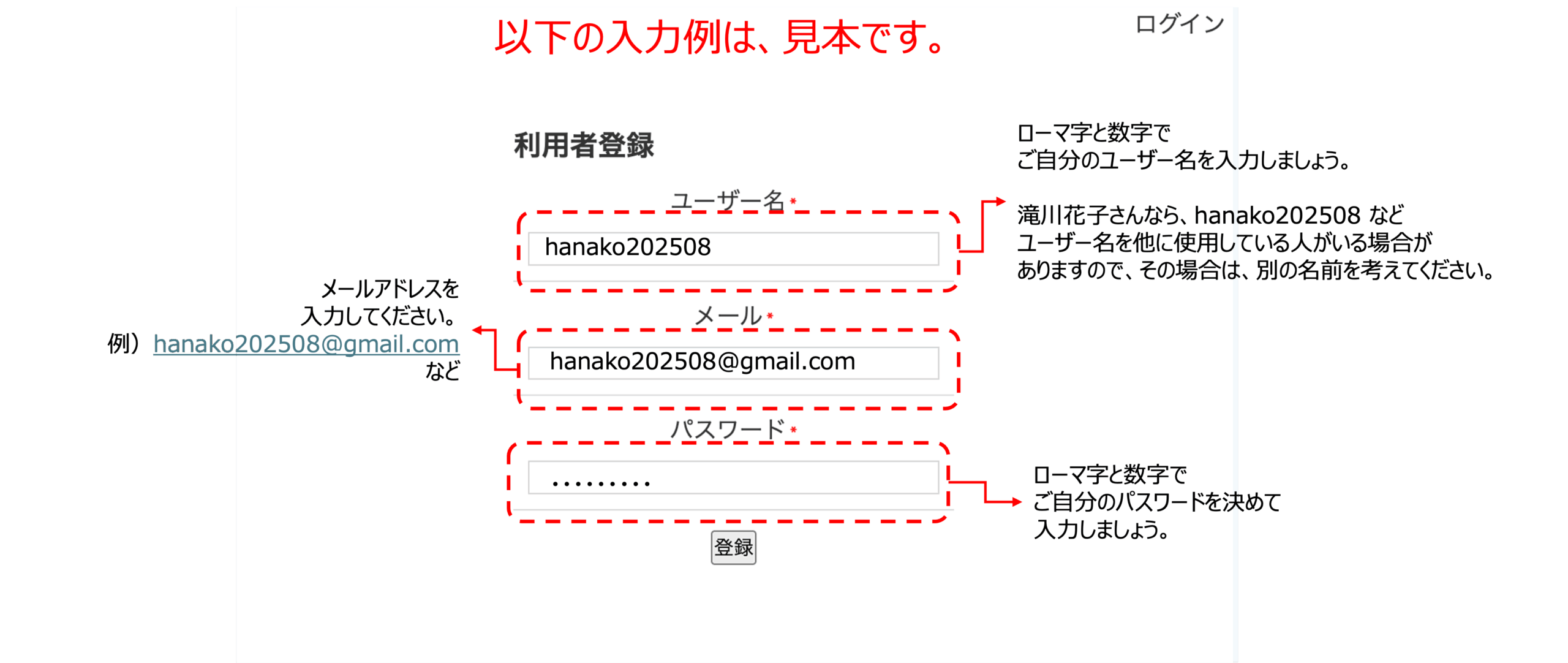 利用者登録をクリックすると、ユーザー名、メールアドレス、パスワードの入力欄が表示されますので、以下の画面に記載したように入力して、「登録」ボタンをクリックしてください。