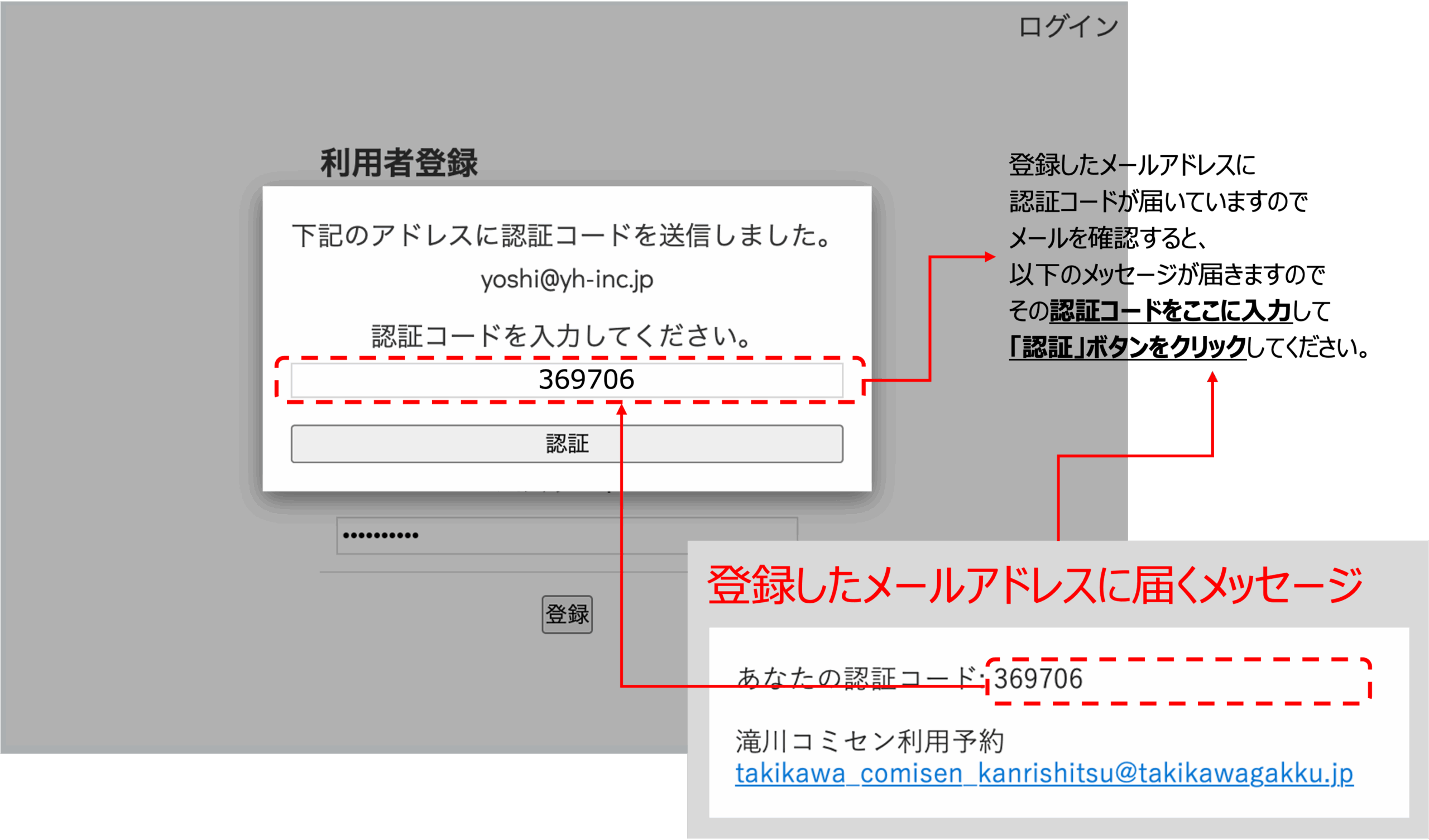 「登録」ボタンをクリックすると、下の画面が表示されます。さきほど入力したメールアドレスに「認証コード」が届いていますので、その番号を入力して、「認証」ボタンをクリックしてください。なお、下の画面にある「認証コード」は見本ですから、実際に登録したメールアドレスに届いた「認証コード」を入力してください。