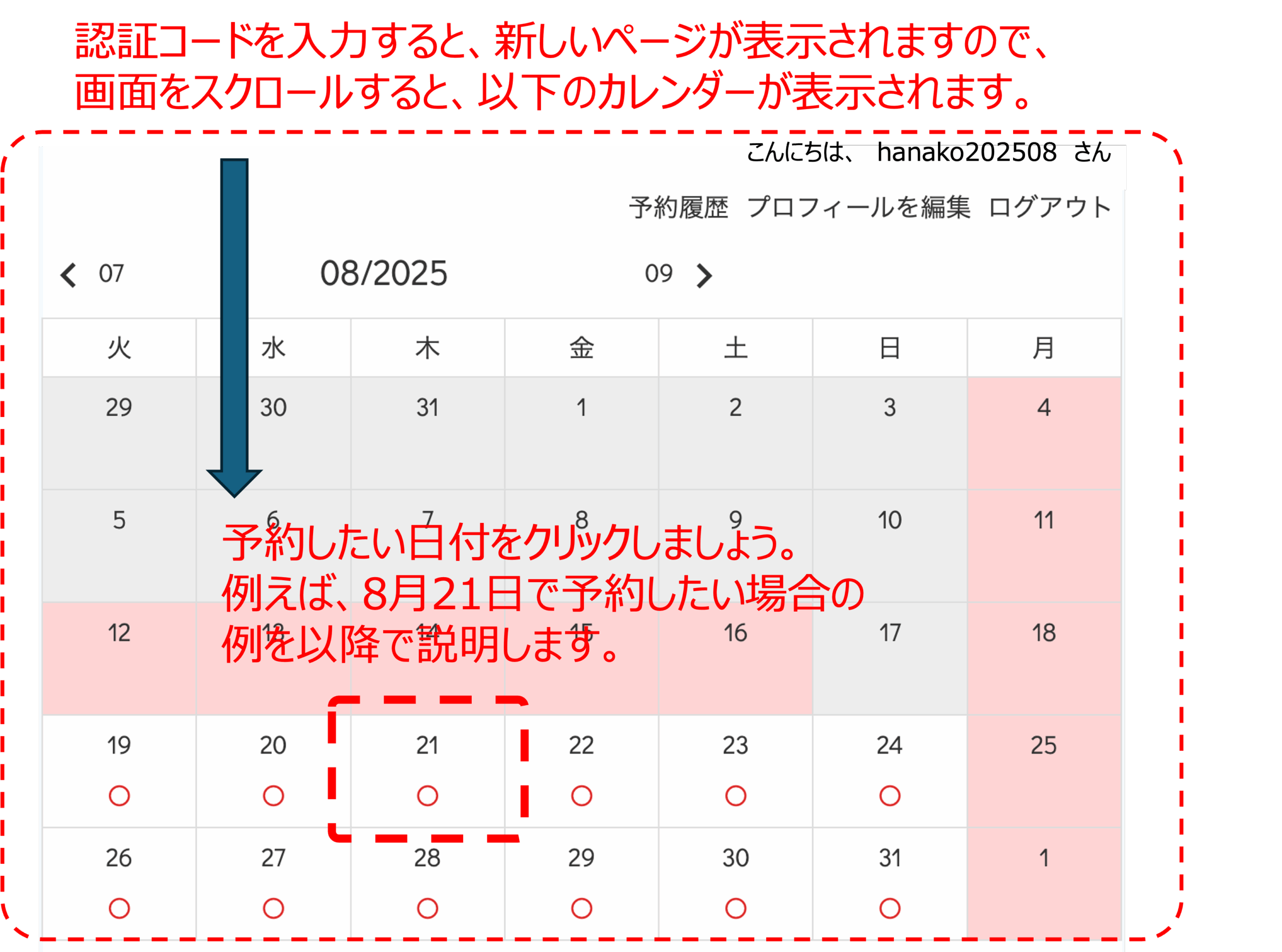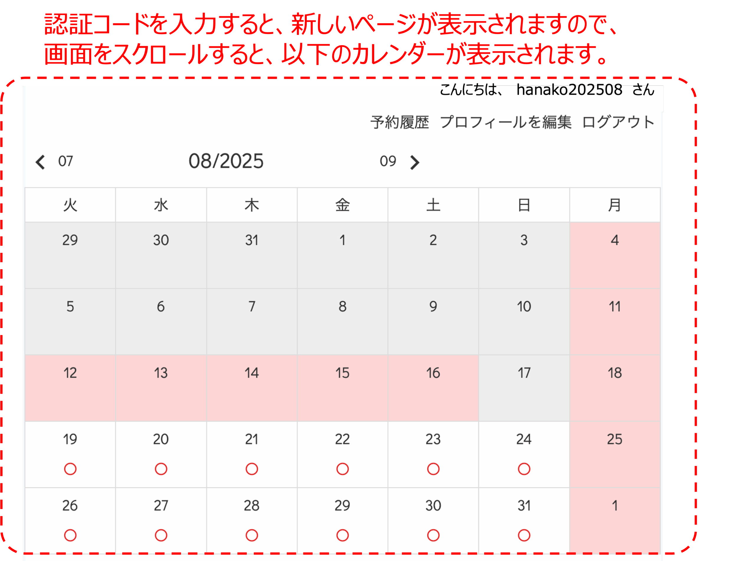 認証コードを入力して、「認証」ボタンをクリックすると、予約カレンダーが表示されます。