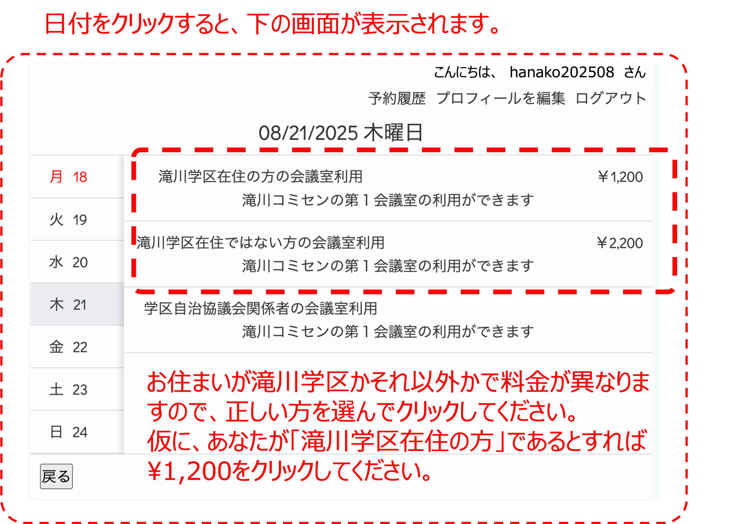 日付をクリックすると、料金の選択画面が表示されます。ご自分のお住まいに応じた料金をクリックしてください。