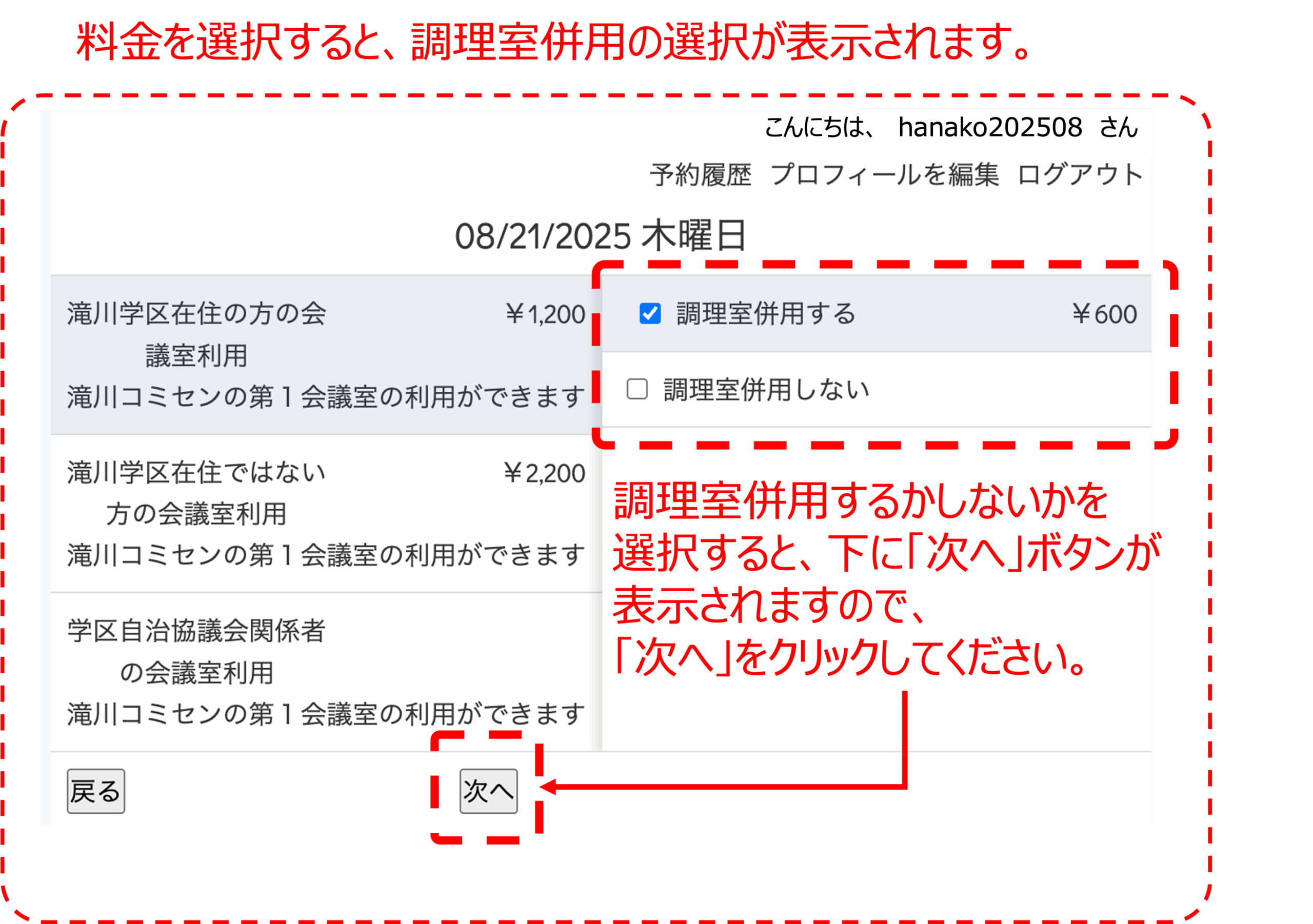 料金を選択すると、下の例では、¥1,200をクリックすると、調理室の併用か、併用しないかを選ぶことができるので、併用か併用しないのチェックボックスをクリックして、画面下に表示される「次へ」ボタンをクリックします。