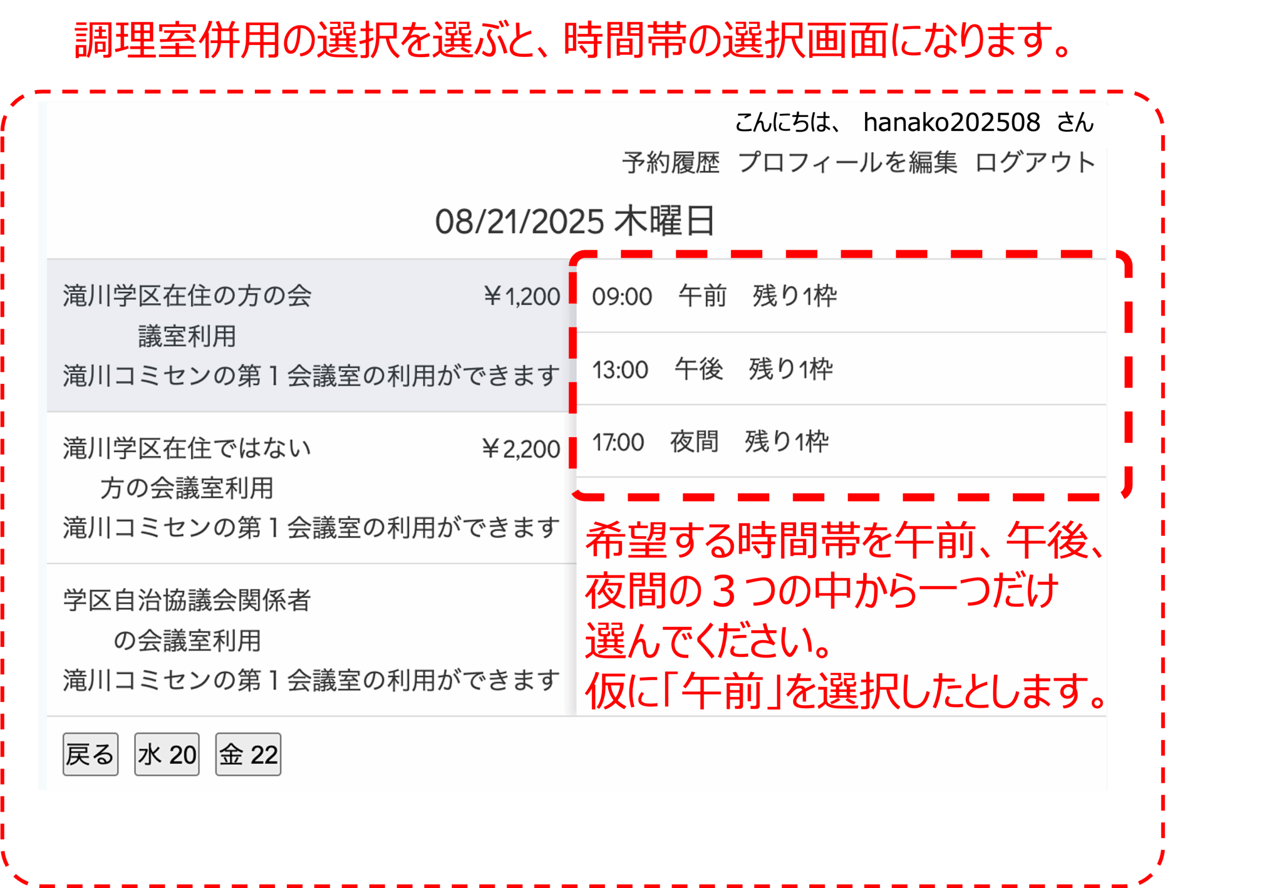 調理室併用か併用しないかのいずれかを選ぶと、時間帯の選択画面になりますので、予約したい時間帯を選んでください。午前、午後、夜間のうちのいずれか一つだけの予約となりますので、午前と午後を予約したい場合は、まず午前の予約が完了した後で、午後の予約を別途行ってください。