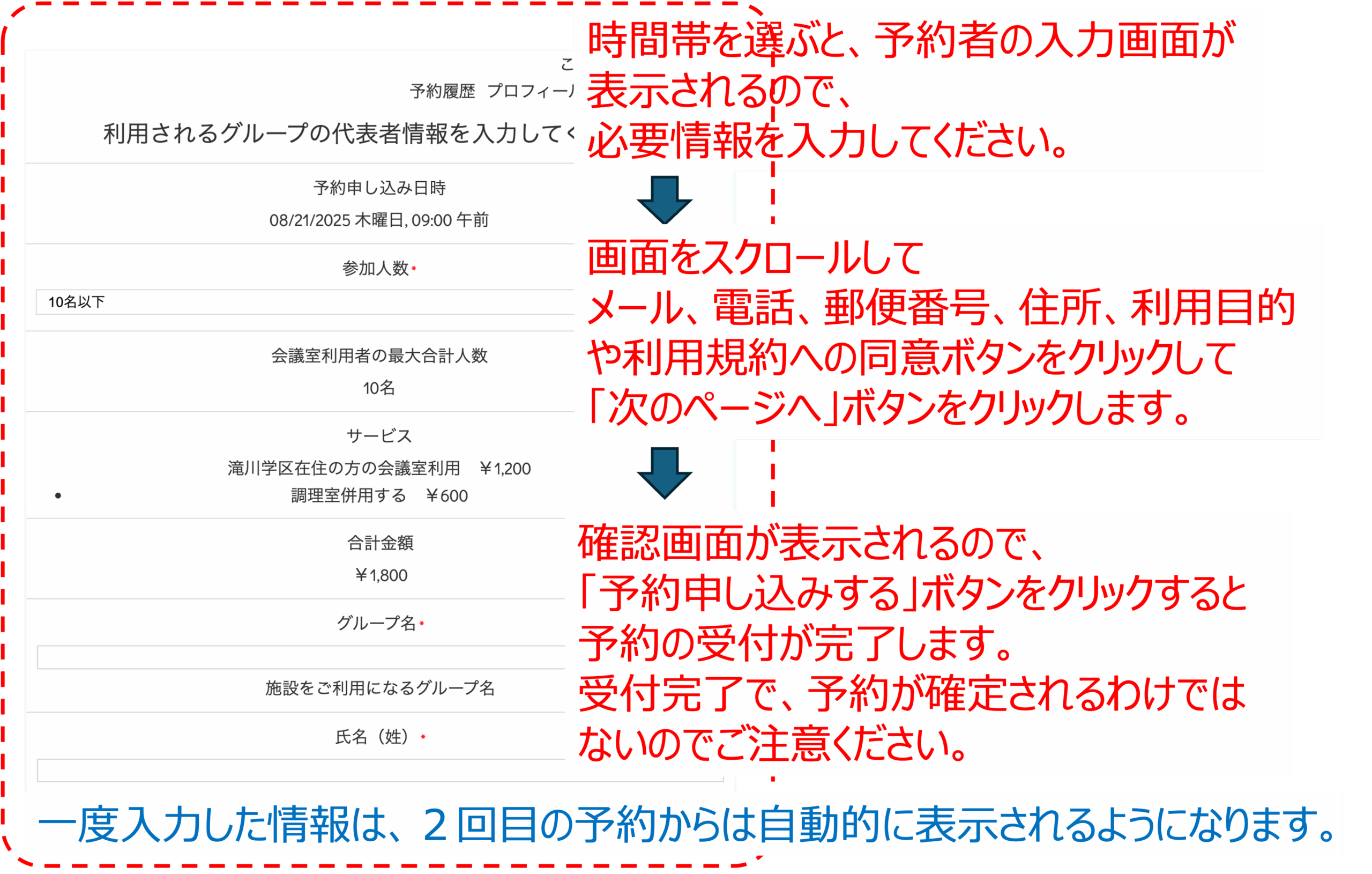 ここで入力したデータは、2回目の予約時には自動的に入力された状態で表示されますので、入力する手間を省くことができます。