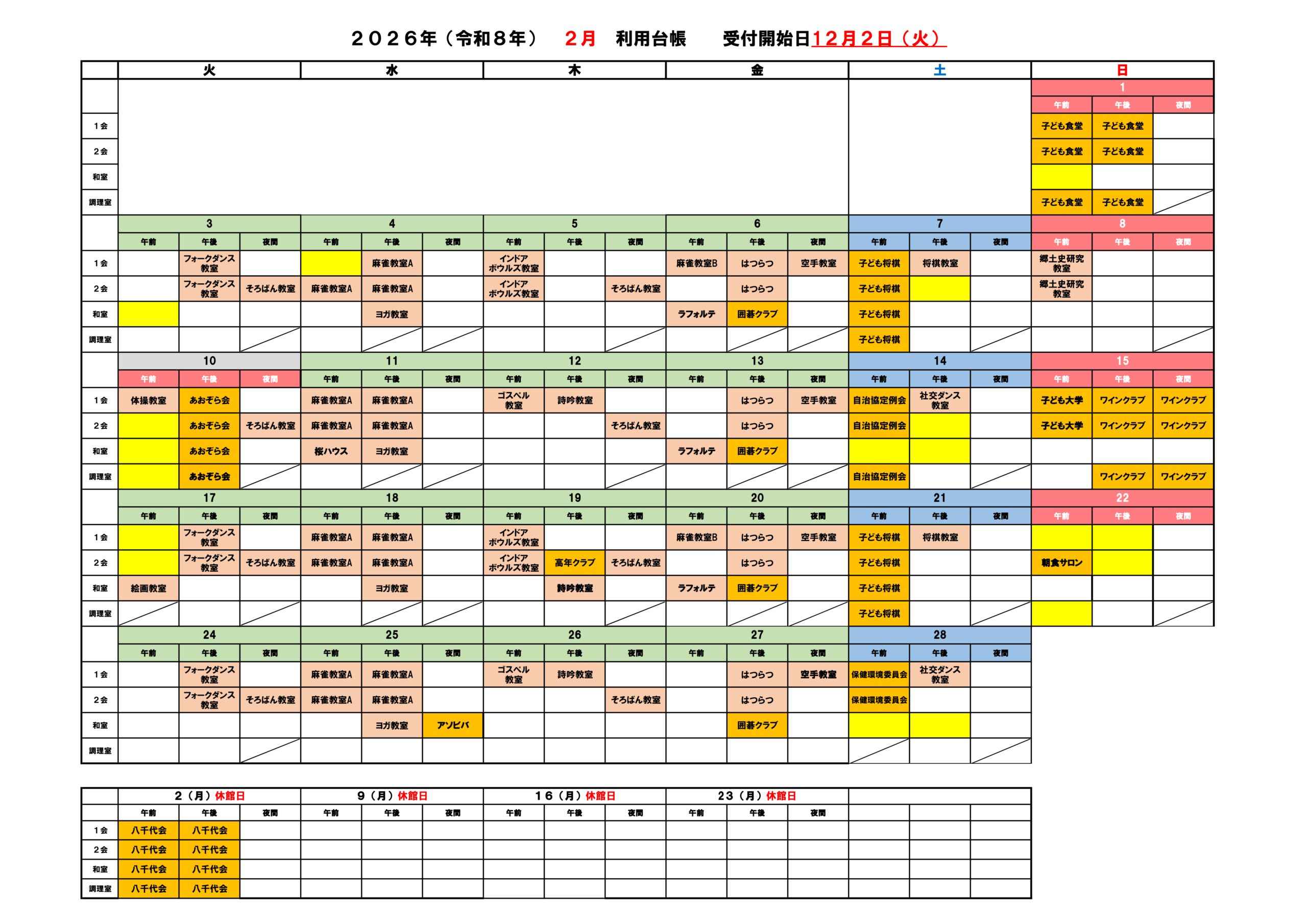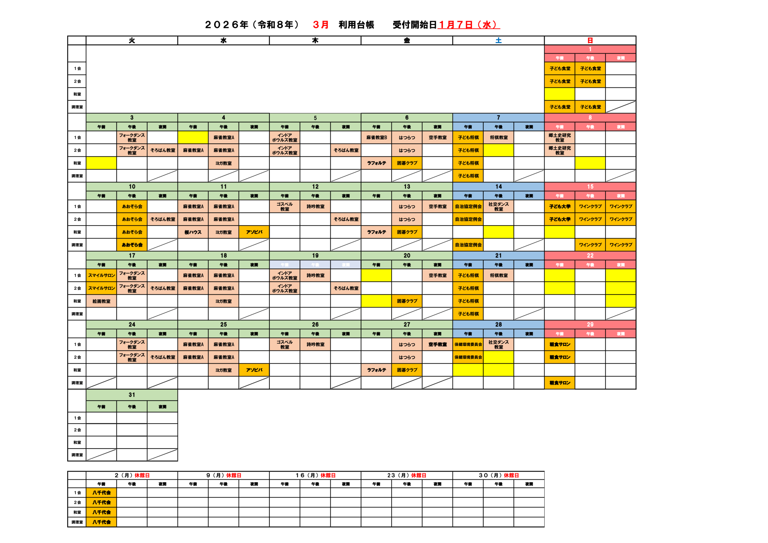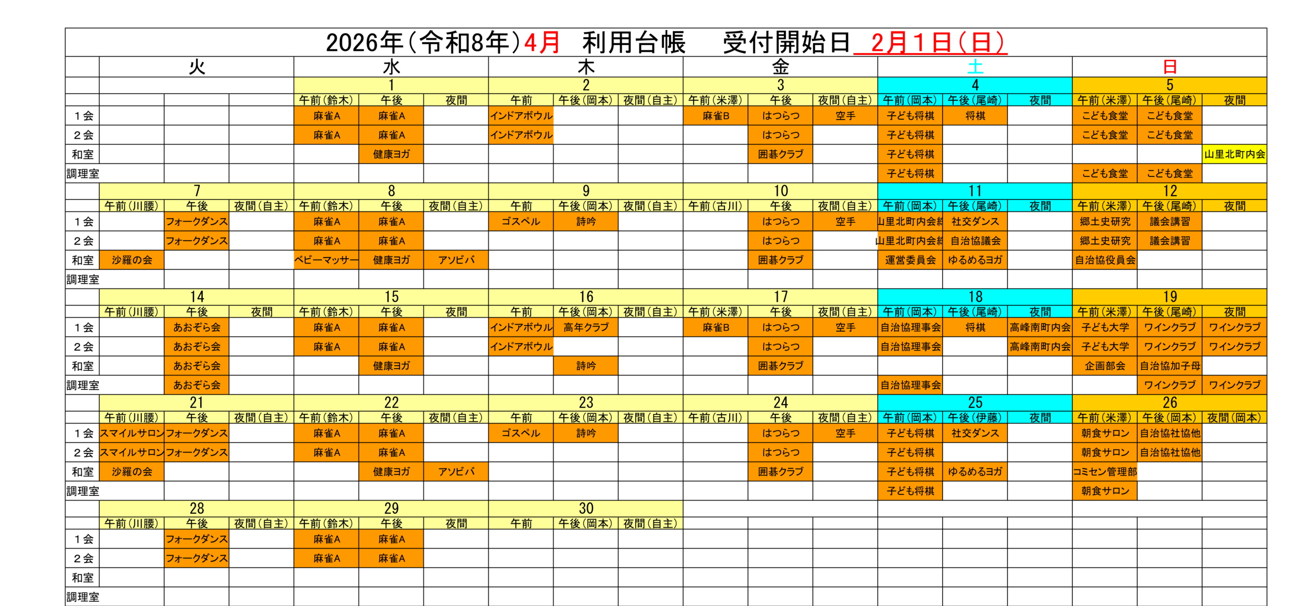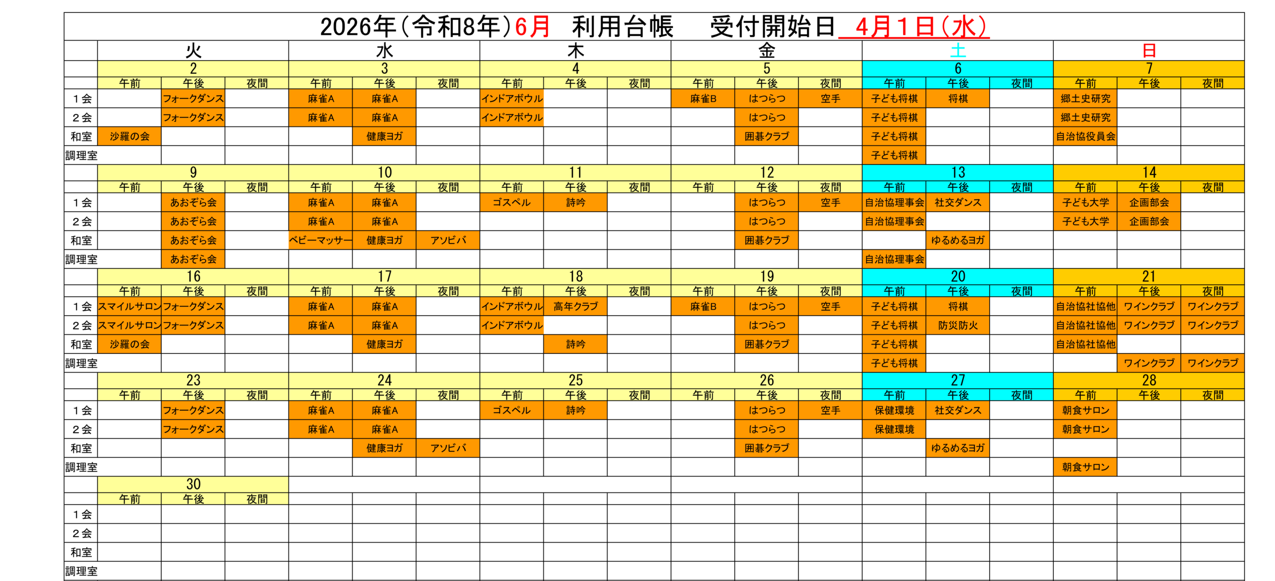 滝川コミセンで開催されている自主活動クラブを含めたイベントカレンダーです。