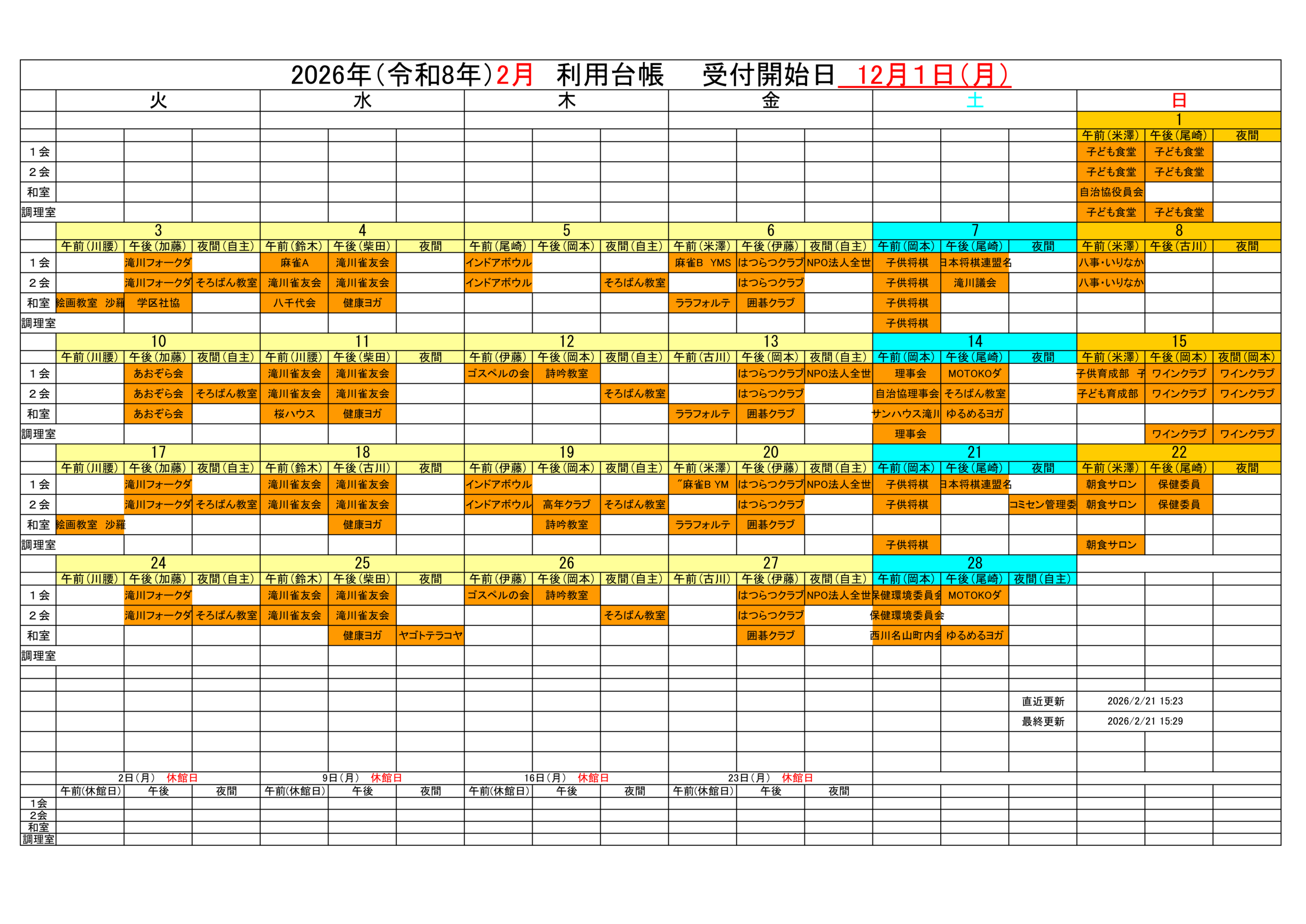 - オンライン申し込みには、滝川コミセンを訪問されてのお申し込みが優先されますので、お申し込み時点で空室でも予約保証をするものではありませんので、あらかじめご了承ください。